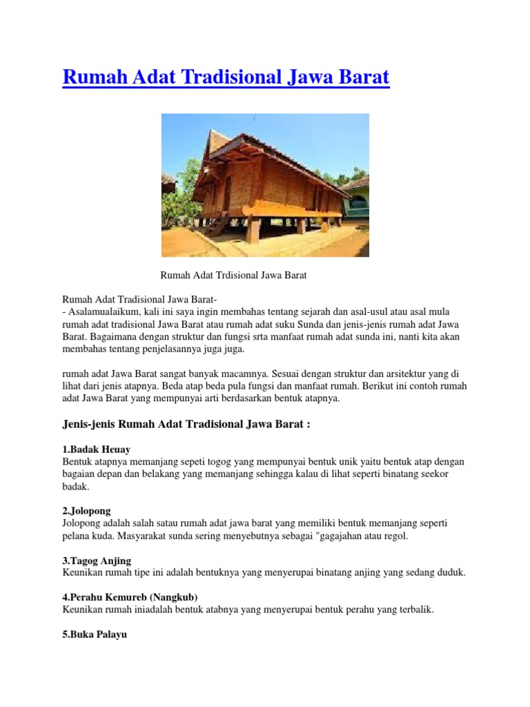 Rumah imah jolopong tidak memiliki bentuk atap yang rumit, melainkan hanya berbentuk segitiga. Rumah jolopong atau lebih dikenal dengan istilah susuhan menjadi rumah adat jawa barat yang kedua. Pariwisata jawa barat sangat kompleks dan juga sangat unik. Bagian bawahannya yaitu kain rereng, dan hiasan aksesori pengantin pria biasanya berupa bendo atau ikat kepala. Hal tersebut yang membuat satu daerah terlihat berbeda dari daerah lainnya. Selain atap yang menyerupai badak, ada juga atap kecil pada rumah adat jawa barat ini yang berfungsi untuk melindungi area teras di depan rumah. Arsitektur rumah adat jawa memiliki aturan hierarki yang dominan seperti yang tercermin pada bentuk atap rumah. Arti dari rumah adat masyarakat jawa barat ini adalah perahu terbalik atau perahu yang tengkurap. Bisa dibilang rumah adat satu ini adalah rumah adat padang yang wajib hukumnya untuk didirikan di daerah luhak nan tigo. Di jawa barat, atau lebih tepatnya kebudayaan sunda, terdapat 8 jenis rumah adat yang memiliki. Rumah adat dari suku sunda ini masih banyak ditemui di daerah pedesaan di jawa barat. Saat ini tercatat indonesia memiliki kurang lebih 1.340 suku bangsa. Berbagai jenis rumah adat di jawa barat.